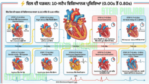 - ਉਥੋਂ Bundle of His ਅਤੇ Purkinje Fibers ਰਾਹੀਂ Ventricles ਤੱਕ ਜਾਂਦਾ ਹੈ